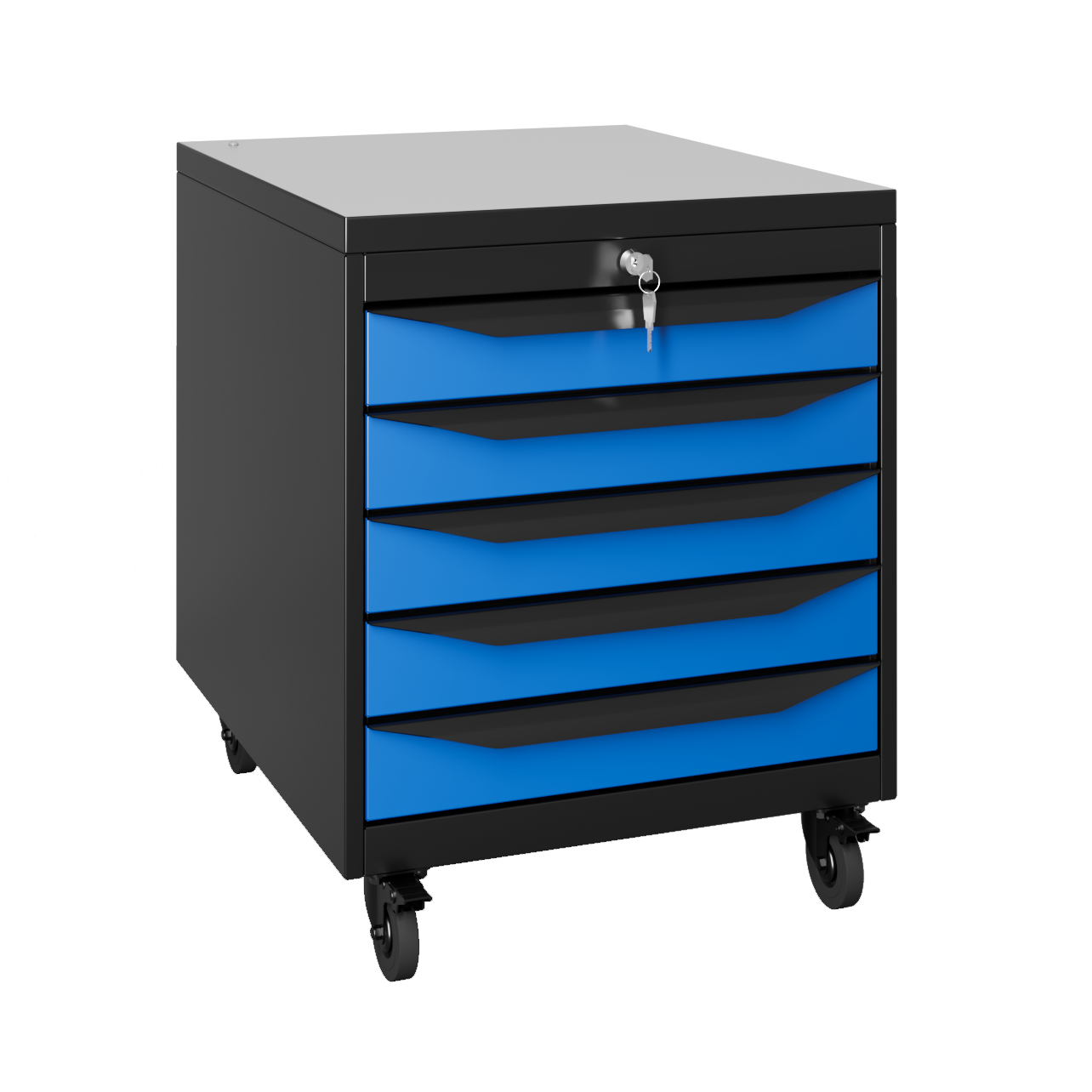 Окраска элементов корпуса осуществляется порошковой антистатической краской: RAL 9011 (темный графит), дверцы RAL 5023 (синий), столешница RAL 7047 (серый).